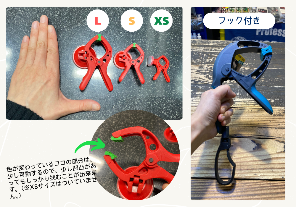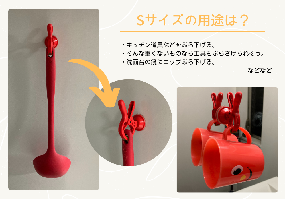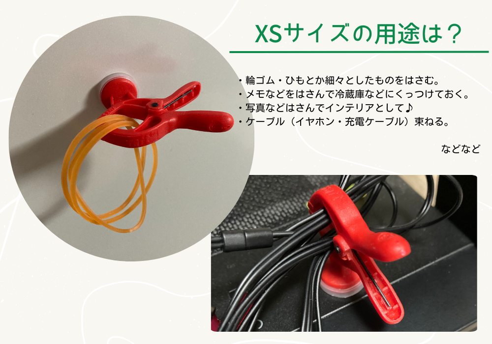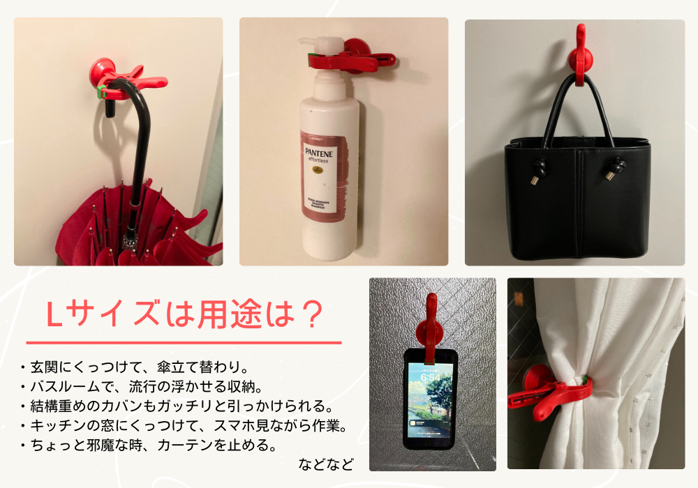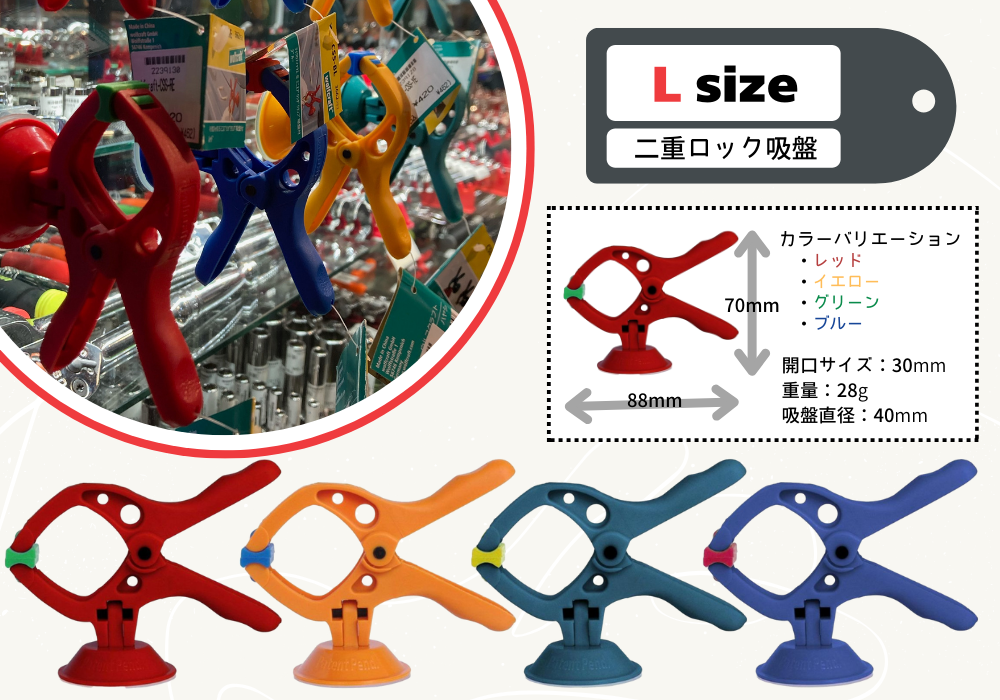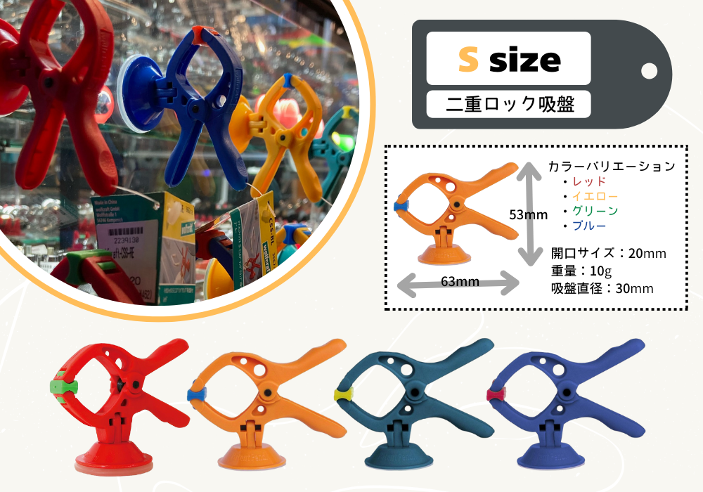 また、最大開閉幅が30㎜でSサイズに比べてクランプ部分の輪?が大きめなので配線がぐちゃぐちだったりする場所のコードを一括にまとめて吸盤で貼り付けておくこともできそう。