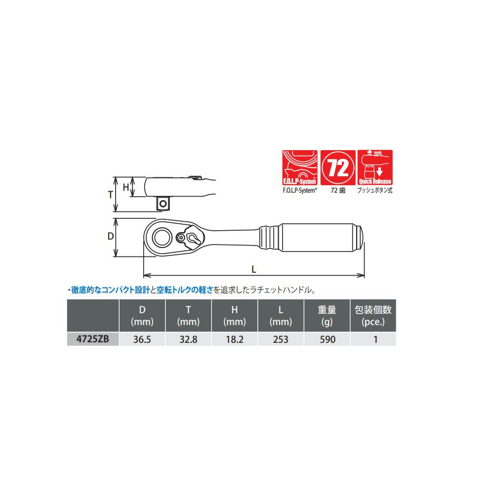 他の画像を見る Ko-ken Z-EAL 1/2"(12.7mm)SQ. プッシュボタン式ラチェットハンドル 全長250mm 4725ZB 定価 ¥ 15,620 ¥ 10,934 税込 カートに入れる お気に入りに登録する