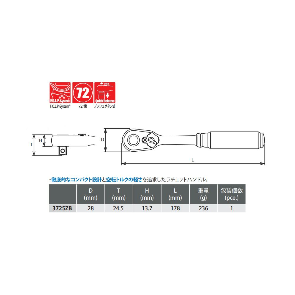 他の画像を見る Ko-ken Z-EAL 3/8"(9.5mm)SQ. プッシュボタン式ラチェットハンドル 全長178mm 3725ZB 定価 ¥ 10,384 ¥ 7,268 税込 カートに入れる お気に入りに登録する