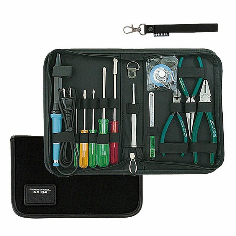 穴付斜ニッパー(NN-45)、電工ペンチ(PD-06)、ラジオペンチ(PR-16)、ピンセット(PTS-02)、ナットドライバー対辺5.5mm(DN-05)、プラスドライバー#00・#0・#2(DS-03・DS-23・DS-64)、マイナスドライバー4.0x0.5(DS-33)、キャップ付ハンダコテ30W、糸ハンダ、ペースト、コテ台、カッター
