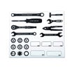 めがねレンチ、ドライバ、ラチェットハンドル、コンビネーションレンチ、ハンマ、モンキレンチ、プライヤ、スパナ、6.3sq. 六角・十二角)x各1枚、9.5sq. 六角・十二角)x各1枚、12.7sq. 六角・十二角)x各1枚、E型トルクス、T型トルクス、ソケット 六角)、ラベル 小)x3枚、ラベル 大)x2枚