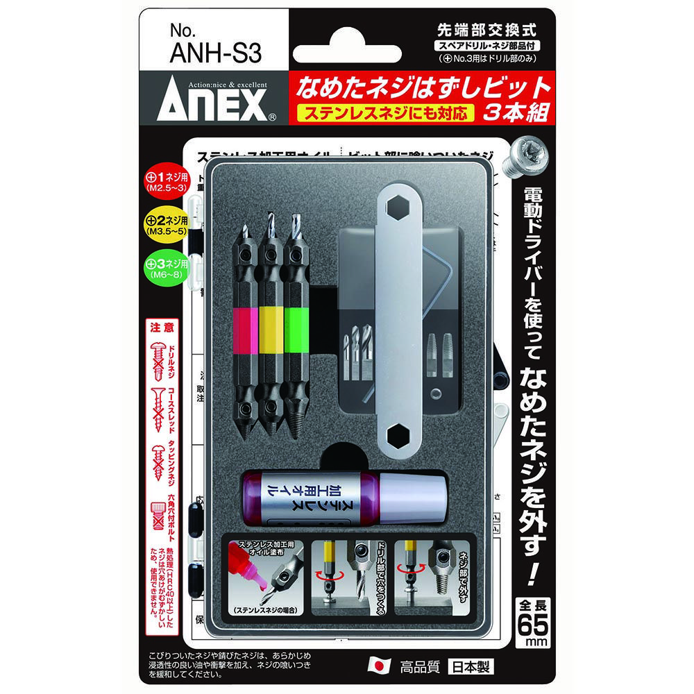他の画像を見る ANEX なめたネジ外しビットX3/M2.5-8 ステン ANH-S3 アネックス 兼古製作所 WEB会員価格 定価 ¥ 4,950 ¥ 3,465 税込 会員特別価格 ¥ 3,217 税込 カートに入れる お気に入りに登録する