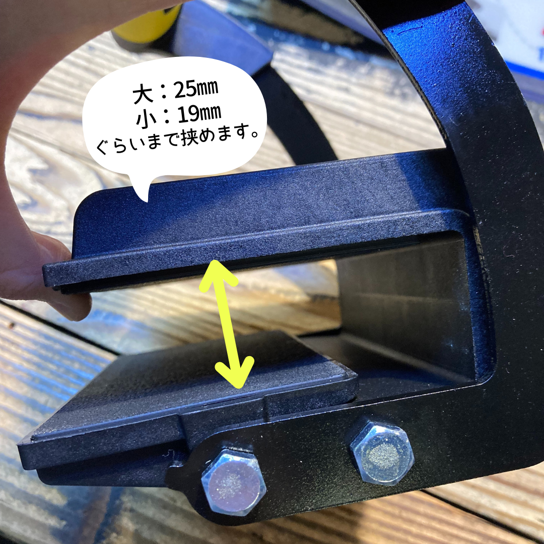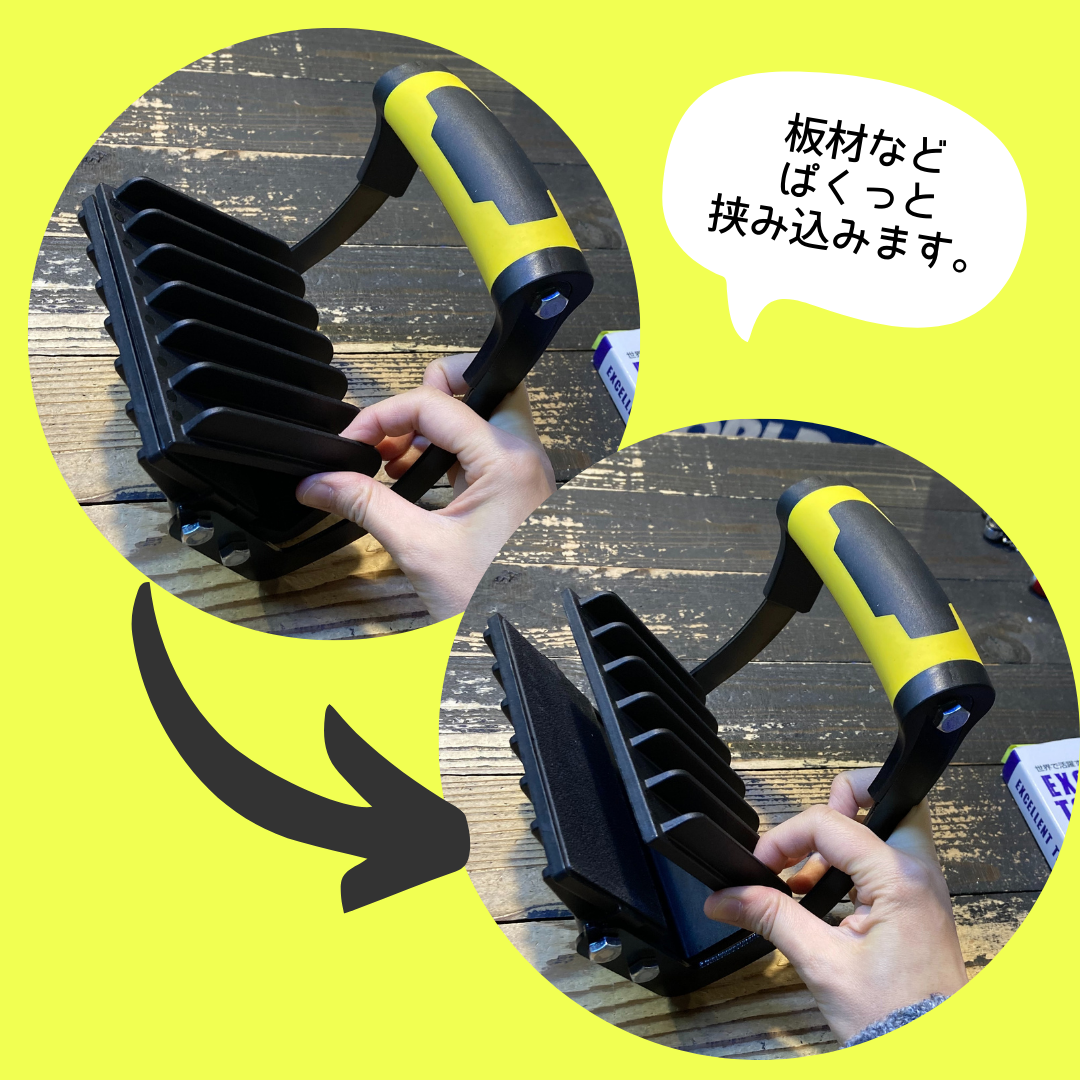 コンパネなど大判の板材など、厚さが5~25mmぐらいまでのモノを挟んで簡単に持ち上げられる商品です!