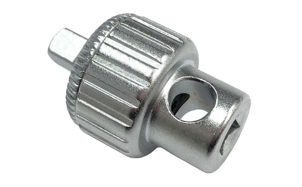 Tハンドルやスピンナーハンドルなど、ラチェット機構を持たない工具に、ラチェットの機能を持たせるアダプターです。 この小さなアダプターを付けるだけで、工具をラチェット化することができます。